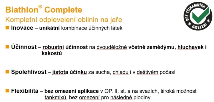 V loňském roce skončila registrace osvědčeného herbicidu Biathlon® 4D kvůli zákazu účinné látky tritosulfuron. Naštěstí se podařilo zajistit adekvátní náhradu a v několika ohledech i lepší řešení (omezení, účinnost na některé problematické plevele).