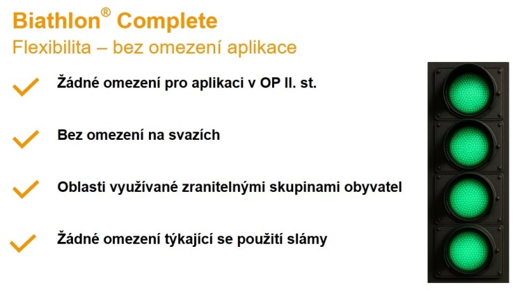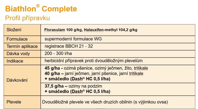 Vítěz v boji proti dvouděložným plevelům Biathlon® Complete je postemergentní herbicid určený na ničení svízele přítuly, heřmánků a dalších dvouděložných plevelů v pšenici ozimé, ječmeni ozimém, žitě a tritikale. Aplikuje se postemergentně v časném jarním i podzimním období.