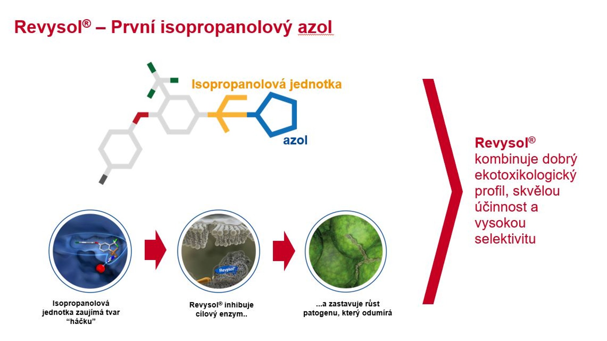 Jedinečné chemické složení umožńuje molekule měnit flexibilně tvar a formu. Při kontaktu s vazebným místem patogenu vytváří tvar „háčku“. Díky tomuto flexibilnímu “háčku“ se Revysol® váže na cílový enzym až stokrát silněji než konvenční azoly starší generace. A to je podstatou výrazně vyšší účinnosti. Revysol® je fungicid patřící do skupiny triazolů a její nové podskupiny isopropanol-azolů. Triazoly jsou páteří strategie ochrany rostlin proti houbovým chorobám a jsou nepostradatelné v zabránění rezistence. Azoly blokují jeden specifický enzym uvnitř buněk hub, zodpovědný za tvorbu buněčných stěn. Revysol® je extrémně efektivní v blokování tohoto enzymu, houba nemůže tvořit buněčné stěny a rychle odumírá.