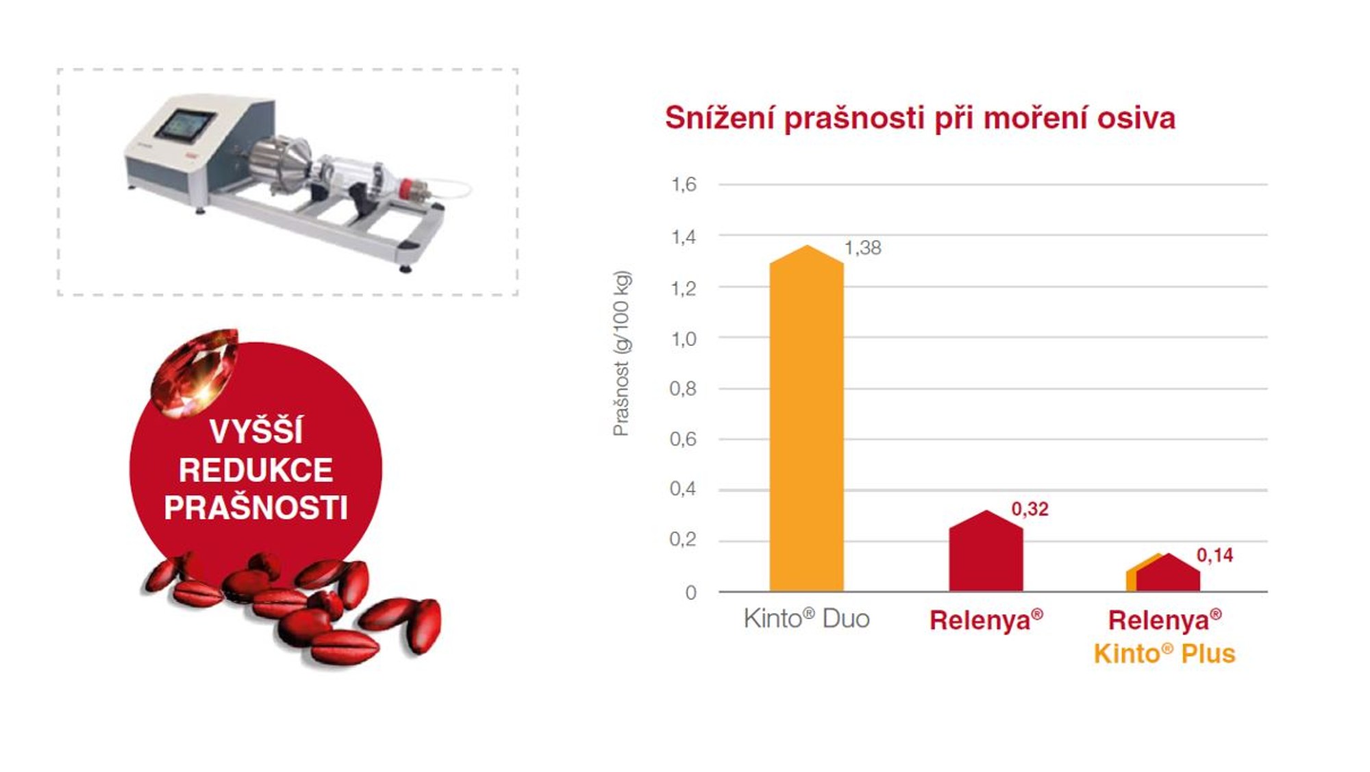 Společné použití mořidel Relenya® + Kinto® Plus zaručuje sytě červenou barvu namořených obilek díky rudé FS formulaci a zároveň zaručuje velmi nízkou prašnost, což ocení zejména obsluhy mořících zařízení.